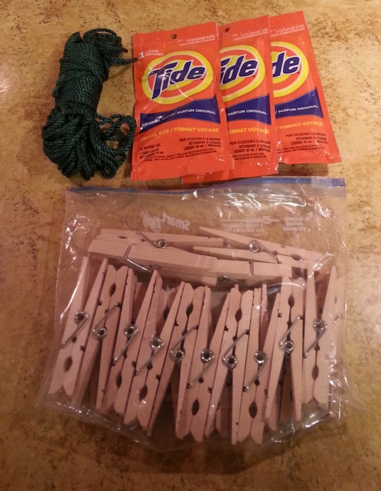 After I've cleaned and sweated, I want clean clothes so I include travel-size packets of Tide, clothes pens, and 50' of 330lb mason twine to make a drying line.
