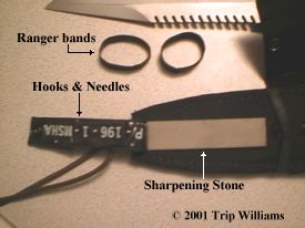 You'll notice the "ranger bands" in the picture above, these are simply pieces of bicycle inner tube that I have cut at various thicknesses. I have them around the sheath to add a layer of rubber to quiet gear that might slap against the sheath, and Ranger bands just have a zillion uses so it's a good idea to carry a lot of them.