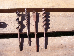 The drill bits look different than modern ones. The tips have a threaded barb which screws into the wood and pulls the bit through, requiring little pressure to drill the hole. Some bits are adjustable for varying size holes.