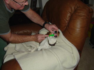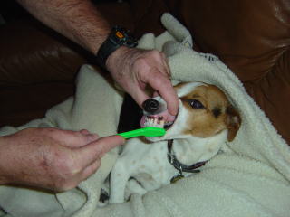 Brew has his own toothbrush and paste its special for dogs and cats. Start using paste on your finger then move to the brush by rolling your pet’s lips and cheeks up, being brushing in short, back and forth strokes. Praise your pet during the entire procedure