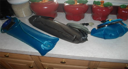 Now that the Century mark of temperatures are here, I write this article to help stay hydrated. I own quite a few camelbak's so this is how I use them on a day to day basis. Before filling the bladders don't forget to clean them up inside and out. First off I fill them all half way with water.