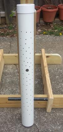 An air-circulation chamber is not necessary but I'm going for max air to minimize time to compost. My chamber is a piece of 38" long 4" PVC, because I had scrap, but any size will do. Drill holes for circulation along the chamber. Remember to drill holes on each side for the axel.