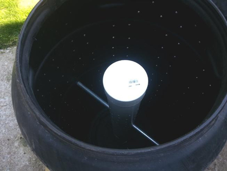 Cut a hole in the bottom of the barrel, insert a PVC flange and screw the flange directly into the barrel bottom. The flange on the bottom and the axel near the top keeps the chamber in place inside the barrel, while heavy debris rotates around it. To help break up large pieces of debris I installed a short piece of 3/4" PVC across the chamber. (Notice the black crossbar in the photo above). Cap the PVC so that debris doesn't fall into the chamber.
