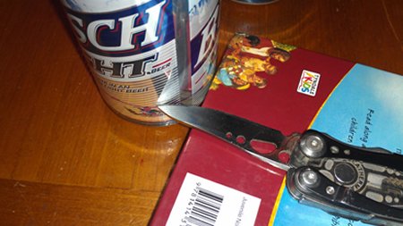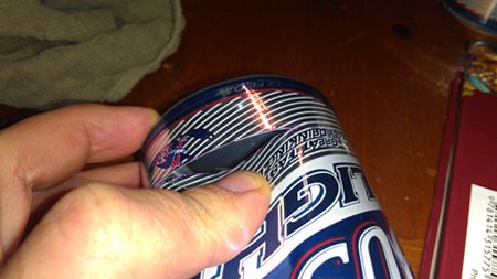 Gently press along the score line and the metal will begin to crack. This may be aided by use of the tip of your knife. Slowly walk the crack around the circumference of the can. Be careful not to crease it.