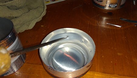 First, starting with an empty and clean can, cut out the top of the can along the rim. A P-38 can opener, properly sharpened, makes this easy.