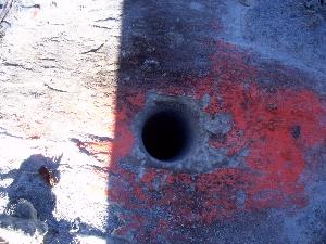 Today we had a slight problem. The brand new bit and a 4' shaft got ruined. The threads on the shaft broke while drilling. We managed to recover the FUBAR'd bit so the hole can still be used. We'll find out who's really responsible for the rental company's shaft breaking. We think they should be. So when you get frustrated because it's a Sunday morning with no rental places open and you're on top of a mountain with no extra bits (rental place was out of them) things tend to get aggravating...as you can see.