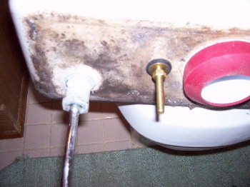 Here we have a constantly running toilet caused by a bad flush valve. The rubber flapper isn’t big enough for the hole so water would easily run by it. The best course of action was to replace the entire valve. The first thing to do is get new parts. The new kit contained tank bolts, tank seal, a flush valve, fill valve and flush handle. It was advertised to contain “everything” you need. Well, it almost had everything. The entire kit cost $20.00. I only used the flush valve so the rest will be saved for future reference.