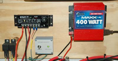 At the bottom center of this picture is my Automatic Blackout box. To the left of that are two relays. One operates my garden lights, the other operates the 400 Watt inverter, which is connected to the CFL bulbs on each side of my driveway.