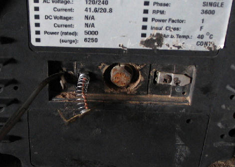 Then you will need to hold the negative lead from the battery in contact with the exposed portion of the left brush, and then tap the positive contact against the right-hand brush. It will make a nice blue arc and a popping noise, and you should be able to hear the generator take on a bit of a load. Sometimes this must be done two or three repetitions for this to work (if three don't do it, you have bigger problems). Now use either a multimeter or appliance to test the generator's output. It should be back up to the standard voltage (Powermates usually produce about 130 volts at the outlets).