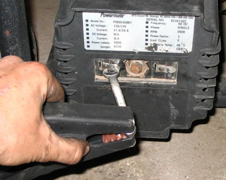 Remove the screw from one of the brushes and pull it out of the genset about a quarter inch. To the left of the screw hole it will be held in place by an electrical clip.