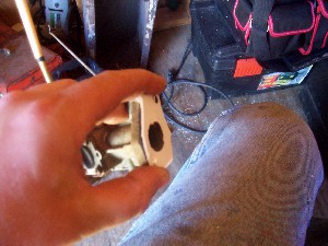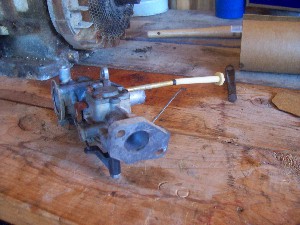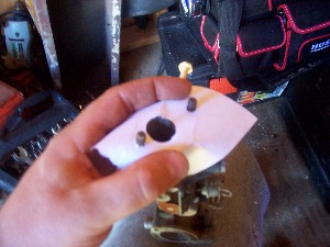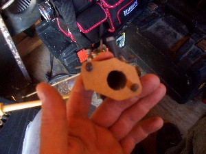 I started by holding the paper over the carb's flange and poking 2 holes with a pencil where the bolts go. I then put the bolts in the flange holes to hold the paper steady and used a Xacto pen knife to cut out the large round hole. The bolts holding the paper would ensure that I cut the large hole in the right place.