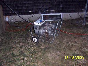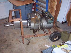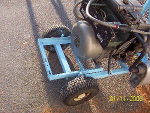 I used some bed frame angle iron and the front tires of an old lawn tractor and built a new cart. I built the rectangle frame first and then welded the tires to it. Then the feet and handle went together. The tricky part was figuring out where to mount the motor and head in relation to balancing the entire cart. I planned on putting a battery behind the generator head part so that extra weight had to be accounted for. If the genny was mounted too close to the wheels and then a battery behind that, the cart would do a wheelie. :o/ So here’s what happened.