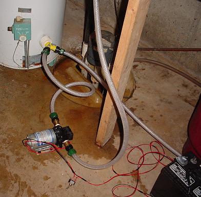 Hookups for the 1st test were quite simple. Two short hoses were made up with female hose fittings on both ends. One hose runs from the output of the hand pump to the input of the 12 volt electric pump. The other hose connects the output of the electric pump to the house plumbing. Two adapters are needed on the pump to accept the garden hose threads.