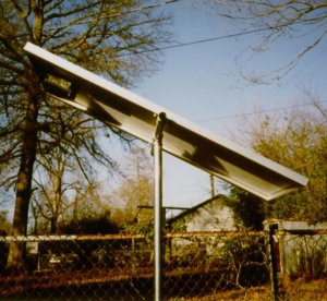 Yep this is going to be what we use for this support bracket. First we tilted the panel to its “normal” position. Then we just held the support bracket up against the bottom of the panel and took note of how much length was needed to give us the full motion of tilt that we wanted to achieve. The other end if this support bracket will be attached to the base pole. The metal strip is rigid enough to support the panels tilt as well as its “pan” position. We marked our strip and cut it to length. Hmmmmm now how do I fasten this to the panel in a way that will let it pivot at its contact point?