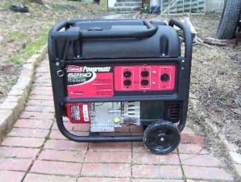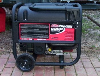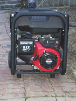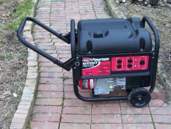 I finally saved up some money and decided to use it on an alternate energy system. The problem is that I don't have a lot of money to spend all at once, so where do I start? Well, after reading a lot of the articles in here about solar power and alternate energy, I decided that the best place for me to start is with a generator. I know that a generator is not the optimum choice, but as long as I can provide fuel for it, I can have some power. The generator I bought does not have enough power to run my entire house, but at 5Kw, it's enough that I can wire it directly into my breaker box and just shut off the breakers that it can't handle. This also allows me to pick and choose. For example, I can run my well pump with nothing else running, then when my water supply is back up to par I can switch over to my Hot water Heater, which will hold hot water for a couple of hours, then I can switch over to the computer, etc. I chose the Coleman Powermate generator. Mine has a Briggs & Stratton 10hp engine. I chose this one for a couple of reasons, one of the primary being that I had used one before (borrowed after Hurricane Isabel, Isabel Debrief) and had liked the way that one performed. I also chose it because it was a decent price, higher than in the past, but still not too bad. The newer model that I got has some features that the borrowed one did not. Mine comes with 2 wheels and a folding handle that locks into the open position, it replaces the need for this article Making A Generator Cart. It also has a muffler already installed (maybe Coleman has been reading the Rubicon's articles: Quieten That Generator). Anyway, here's my generator.