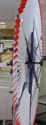 Wood and steel were the dominant materials used on these mills. All the steel units (and many of the wood units) in the museum have a vane to keep the rotor turned into the wind on the upwind side of the tower. The vanes (tail feathers?) are movable and can swing out to the side to stop the mill from turning, as shown in the picture above.