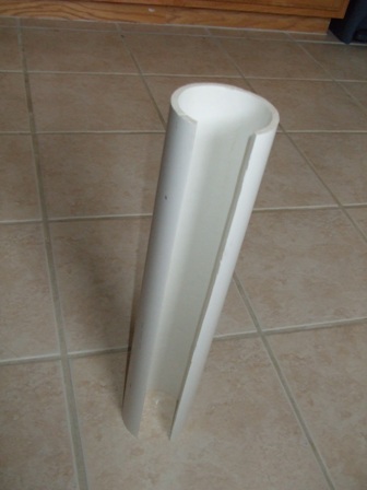 This is a piece of 3" PVC drain pipe. I took a circular saw, cut it to length and then cut a slot so it would fit over the exposed gas line, like this;