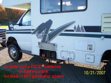 To that end, and because many places we camp do not have “hook-ups” I want eh MH to be as self-contained as possible. We needed electric to power the many things that make life fun, radios, tvs, laptops, lights, etc. The MH did not come with a generator, though it did have a factory space for one. I had two Siemens 75 watt solar panels from a long ago group buy. Which way to go?? Generator of solar?? We finally decided that the solar was more neighbor friendly in almost all camping environments, so I mounted the panels on the MH, and set about figuring out where to put the battery bank.