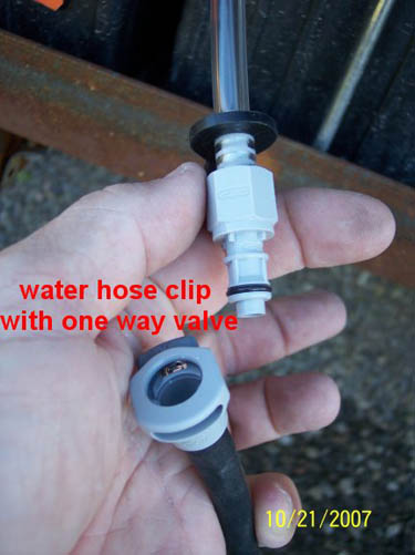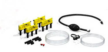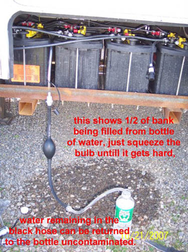 Included in the kits are more hoses than you will probably need, remember the kits are also sold to boaters wanting to be able to fill their batteries from a remote location. One of the nice features of the kits are that they have removable pump systems. The hose from the battery terminates in a one-way flow valve with a nice dust cover. To fill the fluid, you simply take your pump assembly, plug the valve together, place the other end into you water jug and pump the bulb until it becomes hard. At this point the cells should be full to the proper level, and you can disconnect the pump and replace the dust cover.