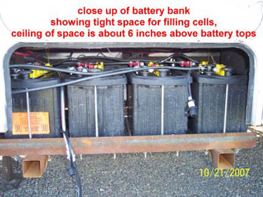 The solution I have come up with is two sets of “Qwik-Fill™ Dual 12-Volt Battery Watering Systems”. Each set is designed to allow easy remote filling of 2 batteries. I found our kit on sale at CampingWorld.com.