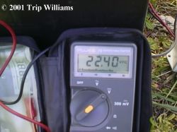 (The same two panels charging the same battery, but notice now that the charge controller keeps the voltage (and amperage) under control.)