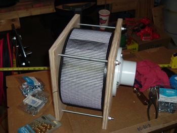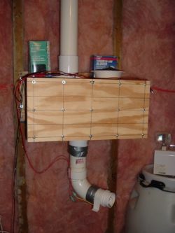 This is the filter assembly installed in the attic. Note that all PVC pipe fittings have been properly primed and glued together so that the whole length of pipe and all the joints are airtight. A prefilter will also be stapled to the outside edges of the plywood to prolong the life of the HEPA filter.