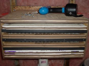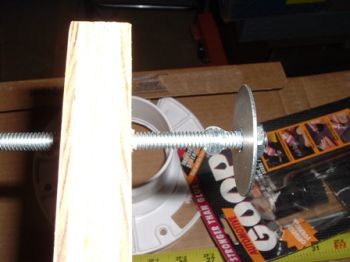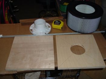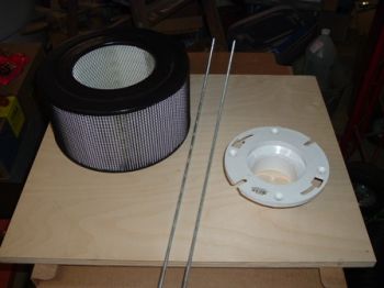 Here are the main parts for the new filter. The round HEPA filter in the upper left corner is a "get it almost anywhere" Honeywell 20500 type. Home Depot sells these, as do numerous web-based companies. The rods in the center are 36" long, 1/4x20 all thread (threaded along the entire length of the rod). These are also available at your favorite home improvement store. The white PVC fitting is called a toilet flange and can be found in the plumbing department. The plywood is ¾" cabinet grade, sanded both sides. Don’t skimp here because you’re going to be counting on that piece of wood to hold the filter and toilet flange tightly together.