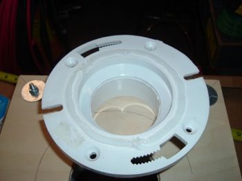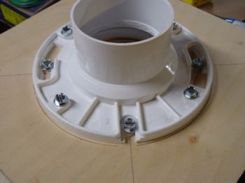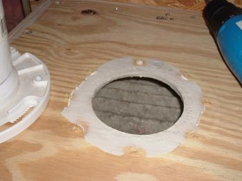 I centered the toilet flange and pressed it down on the end cap over the big hole, then drilled some pilot holes for some ¼" hex head sheet metal bolts, put silicon caulk into the pilot holes and screwed the flange down. Be careful that your screws aren’t so long that they penetrate into the HEPA filter.
