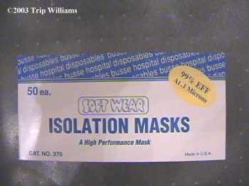 We got our isolation masks from RainDog Outdoors. If you watch the news, These are what you see the citizens of China wearing on the street. Many U.S. Distributors won't send them out of the country due to a world wide shortage thanks to SARS and terror threats (I actually think there are plenty of masks right now, but the USA is expecting shortages and trying to keep the masks at home). Several friends in other countries have e-mailed me asking for isolation masks since they can't find them at home.