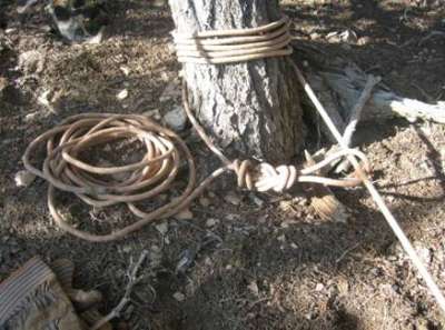 This is called a tensionless hitch. Most knots weaken the rope, this one does not. The entire strength of the rope is retained, but that is not why we are using it here. We are using it here because there is no load on the knot. Because come-alongs usually only have 5-20 feet of throw on them, you will have to reset the knot on the anchor several times. If you tied a regular knot in the rope around the tree, it would be very hard to untie it once it was loaded. With this not, it is easy to untie.