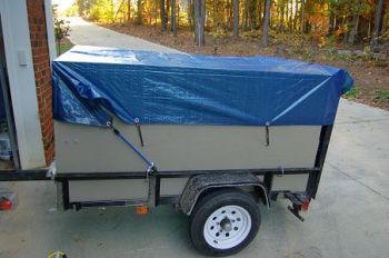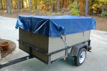 Step 4: Attach tarp. Note that in this picture, attachment points have been screwed into the plywood on the sides (and in the front) to attach bungee cords to tension the tarp. Apply other bungees as needed to wind-proof the tarp. Loading can be done after the tarp is on in case of bad weather. Then close ramp, drape tarp over it and bungee.