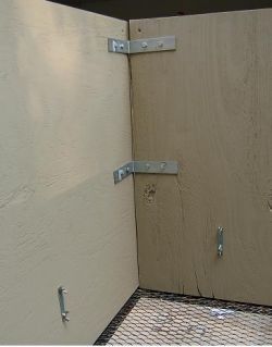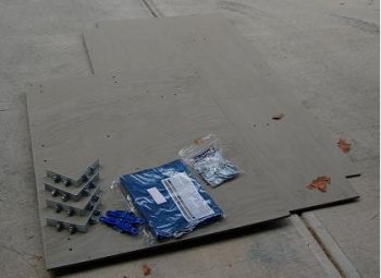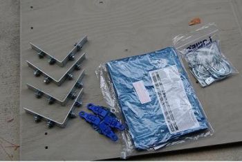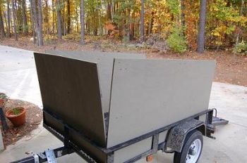 The walls are made from 5/16" plywood, about $10 per sheet at the local Lowes. The thin material was used so it’s light to move from storage to the trailer when setting it up. To weatherproof the plywood, I bought a "wrong color" can of stain at Lowes for $5. They usually have a table in the paint department of paints and stains that were mixed to the wrong color for someone, and they sell it cheap! This gallon of stain usually goes for $30!! The tarp is a 6x10 lightweight, there are some U-bolts and four angle brackets with nuts and bolts to attach them to the plywood and form the leading corners.