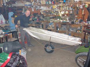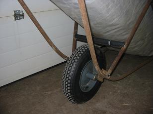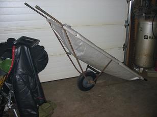 I built the unit with ½” galvanized steel pipe (regular type). I took two pieces 10 feet long and bent them in a vise so that they would form a “V” shape (bottom of the “V” is where the wheel fits) and then I bent the two top extremities to bring them horizontal -(for handles where my hands fit). I then welded in between the two handle ends small angle irons (bed frame angle irons - very sturdy and light - I had these already). These pieces of angle iron form a rectangular shape - the top part of the carrier. All the parts are welded together. I then purchased a wheelbarrow wheel from a supply shop ($25.00 Canadian). This included the axle and the axle fasteners for each side of the axle. I welded a small angle iron on the bottom of the “V” shaped ½” tubing and fastened the wheelbarrow wheel to these small angle irons using regular ¼” bolts. I also welded a brace on each side from the wheel to the top angle iron as well as a crosser above the wheel - to solidify everything.