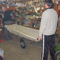 The carrier is all finished. The carrier can be used by only one man as the top picture shows (just like a wheelbarrow) but is much more effective with two men (lower picture) who carry it like a stretcher. The wheel usually carries the whole load but when a dead tree or any other object is encountered in the way, the two men simply lift the whole carrier over the object. If only one man uses it he can load the carrier by letting one set of handle down on the ground as the above picture shows.