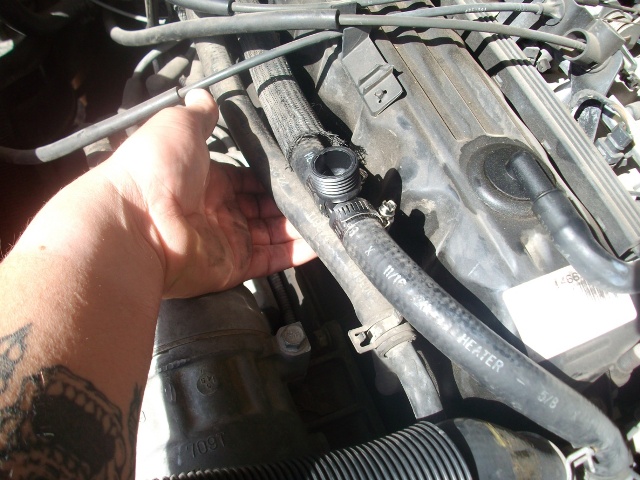 First off, you have to find the Upper Radiator hose coming from the firewall going to the Thermostat Housing. The other Hose goes to the Water Pump and we are not using this hose. Cut the Hose in this picture it is the upper hose that I am holding and already has the T fitting in place.