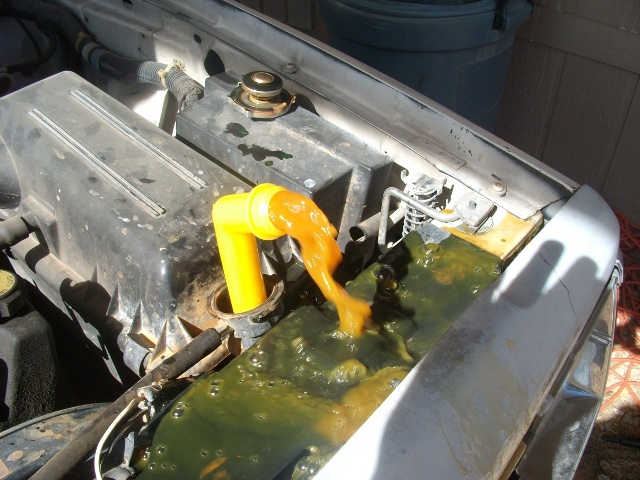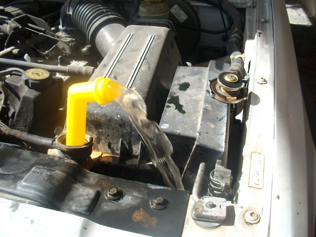 Run the water for 5 to 10 minutes or until you have clean water flowing from the direction outlet. Once clean water is flowing, turn your vehicle off. Drain your radiator, hook up all hoses and start the vehicle to install your Anti Freeze I used a 50/50 mixture. With your vehicle running, stop when fluid backs up out of the radiator cap. I had a few other steps to do before I could fill with fluid so on to the rest of the article.