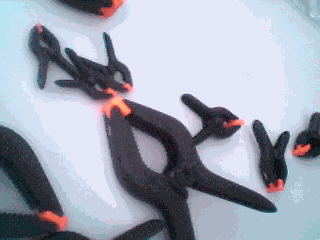 At first I tried to hold these blankets on the roof with bungee cords, but that didnt work at all. So I went to Wal-Mart and bought a bag of 16 spring clamps for less than $5 and now just clamp the blankets to the roof. Here are pics of the clamps and the clamps holding a "blanket" in place over the tenting.