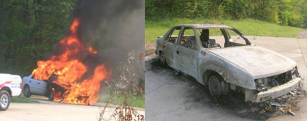 Long story made short, they smelled the unmistakable smell of electrical wires burning, quickly got everyone out and away, and called the fire department. They were at a friends house who happens to live way out in the county, so it took the pumper truck about 25 minutes to get there. A good response time for an all-volunteer squad like ours (we're short-handed), but far too long for a car fire. If you don’t get there in just a few minutes for one, it’s really too late. No one was hurt, but the car was a total loss, as expected. I was at the other end of the county…when I got there, the picture on the right was awaiting me.