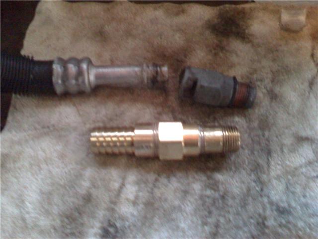 What I did for a replacement was go down to the local hardware store and find a fitting or a combination of fittings so the threaded end is ½” NPT and in my case the barbed end was ¾”, but some may be 5/8” this depends on your truck. In my case I needed three fittings to make it work and cost about $7.00. For just a new factory style fitting the cost is about $35.00 at my local parts store, and this does not include the male hose end. In some cases a person can cut off the crimped section of the factory fitting to replace the hose but I prefer to prevent problems down the road. When reinstalling the fitting make sure you use plenty of good quality thread sealant to prevent leaks.