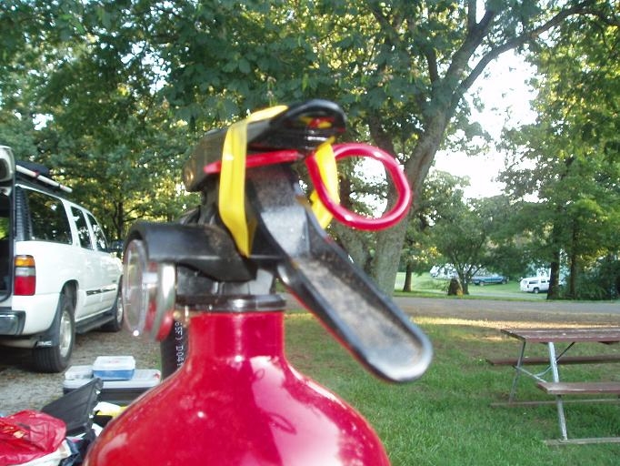 While returning home from our vacation and the Rubicon 2009 IC, my wife and I pulled into a RV campground for the night. I decided to reorganize the bags and containers in our vehicle and in the process of removing a clothes bag from the cargo area I heard a sound that I will not soon forget as the air was quickly filled with a yellow haze. Yes, I had just discharged an 8 lb dry chemical fire extinguisher in the back of a 2004 GMC Yukon full of camping gear.