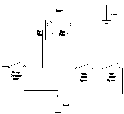 You are creating a bypass to ground circuit to allow your locker relays to activate regardless of transfer case position or TPIM inputs. While this will allow you to destroy your differentials, transfer case, or axles on dry pavement - it is designed to allow you to operate your lockers when not in 4WD-Low. This can be useful in sandy environments, high-speed mud running etc. This system does not disable the factory system. It will operate different from the factory system. Under normal operation your locker indicator lights will remain solid during operation. With this bypass, your locker indicator lights will blink until disengaged. (see diagram below)