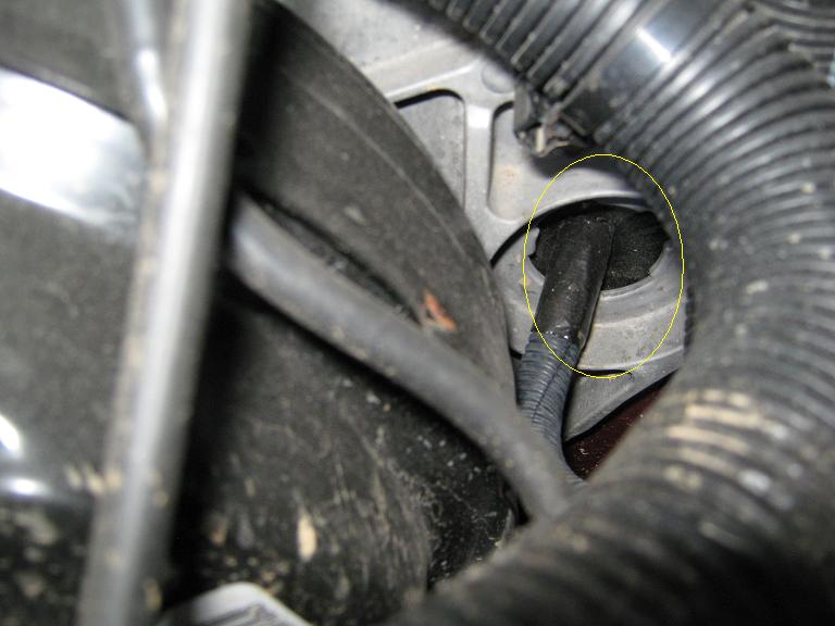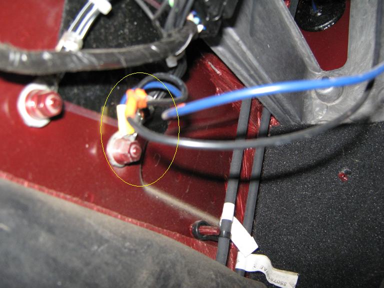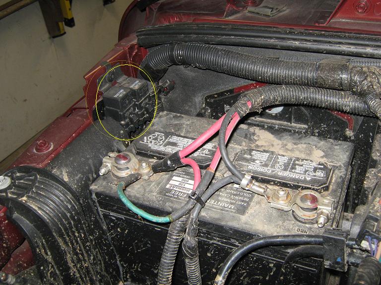 Now locate the plastic rivet holding the relay bracket to the fender-wall and loosen the rivet until the relay mounting bracket comes loose. Pull as much slack as possible on cables and lay them into the empty battery tray area.