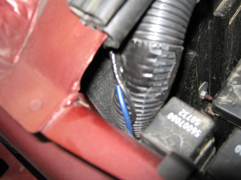 Solder 1 of your wires to each ground coming out of the relay (I tried wire crimps first but they did not work well for me). Repeat for the other relay. Tape and heat shrink your solder splices well, this area of the engine compartment gets a healthy dose of mud (see pictures). Tape ends of looming to prevent wires from being seen, or coming loose due to vibrations.