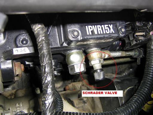 You will connect the pressure gauge to the Schrader valve at the injector pump. A Schrader valve resembles the air valve on a tire. There is one located on the inlet of the filter housing and one on the inlet of the injector pump. Below is a picture of the one located on the injector pump. It is the one with the black cap.