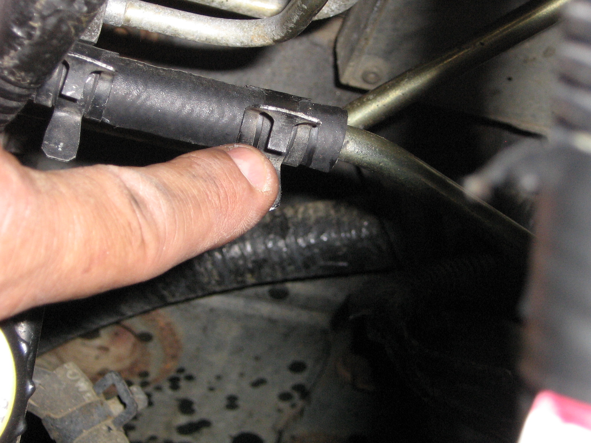 I used the following procedure to test the flow rate on my truck. There is a short piece of ¼” flexible fuel line between the filter housing and the injector pump. I removed this fuel line by loosening the clamps and sliding them out of the way and then pulling the housing off of the metal tubing.