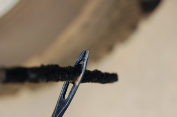 So now the plug is loaded and ready to go, let’s take a close look at the holder, it’s pretty clever. You’ll see it’s like a needle, but the end is split. This is how we get the inserter out of the tire while still leaving the plug in there.