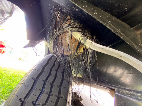 The tire was not a retread, but the cap of the tire tore most of the way free, beat the snot out of the tire well, damaged the trailer skirt, then wrapped itself tightly around the axle.