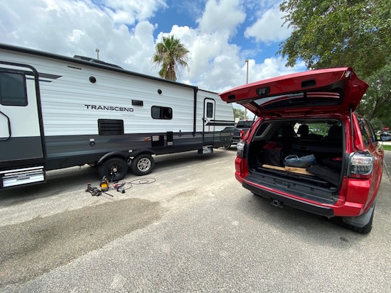 I grabbed a floor jack, cordless impact wrench, large impact socket set, dunnage, a Viair air compressor, a 12V jump pack, tire gauge, a couple of tool bags that live in the Jeep, and headed their way.