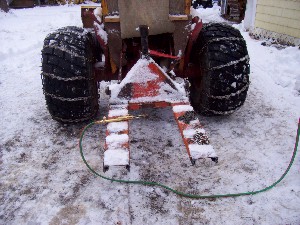 Dad built the tire chains. The side chains came from an old set of vehicle chains and the cross links are 5/16's chain. They work great. They don't rattle my teeth out while going down the road and they grab the slippery ground good.