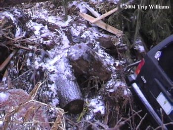 The Jeep is sitting at an odd angle, nose down, kinda on it's side, on stumps and felled trees. Imagine going off a cliff with huge pungi sticks at the bottom and you have a VERY accurate picture of how things are.. the back and middle of the Jeep is impaled on these jagged stumps like an apple on a spit.... it's a total loss.